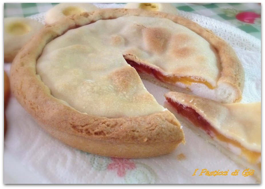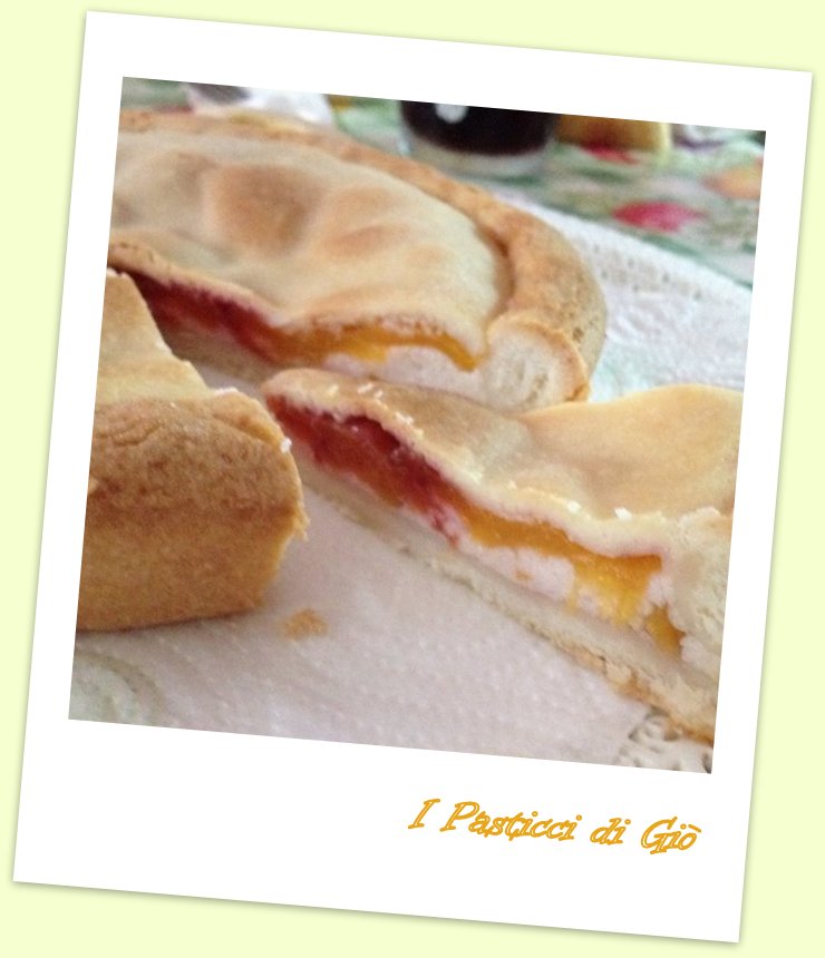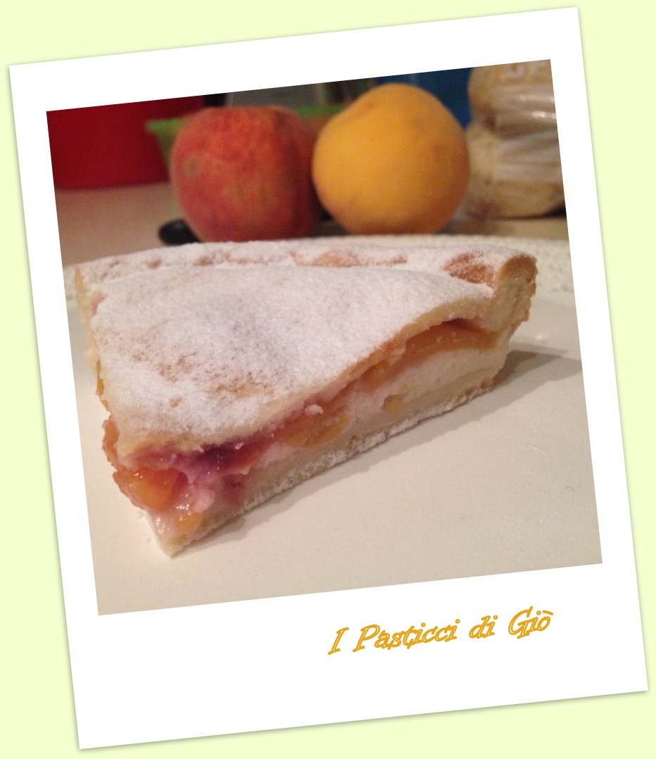 Impastate la pasta frolla con metodo classico o con metodo sabbiato (vedi post. preparazione della pasta frolla )e ponetela in frigorifero per il riposo. In questa preparazione ho preferito utilizzare il metodo sabbiato piuttosto che quello classico, in quanto a mio parere è molto più piacevole al gusto sentire la friabilità della frolla. Una volta pronta, spolverate il piano di lavoro con abbondante farina, stendete la frolla con spessore di 4 mm e ricoprite una teglia rotonda (17,5cm di diametro della base), precedentemente imburrata e rivestita con carta forno nella base. A parte in una ciotola, mescolate i due vasetti di yogurt con i 30 g di farina setacciata, affinché otterrete un composto con consistenza simile a quella della marmellata. Ora riempite la torta con il composto di yogurt e rivestitela con uno strato di fettine di pesche tagliate sottili. Stendete uno strato molto sottile di zucchero e coprite la vostra torta con il resto della frolla stesa con spessore di 3 mm circa. Spennellate a piacimento la superficie con della chiara d’uova mista a panna (la proporzione è 1:1). Cuocete in forno ventilato preriscaldato a 180°C per circa 20-25 minuti. Fate raffreddare prima di servire. Conservare in frigorifero per 4-5 giorni. Per guarnizione potete spolverizzare la superficie con zucchero a velo, e cospargerla con fettine di pesche semi-candite (per la semi-canditura questo è il post: frutta semi caramellata ).